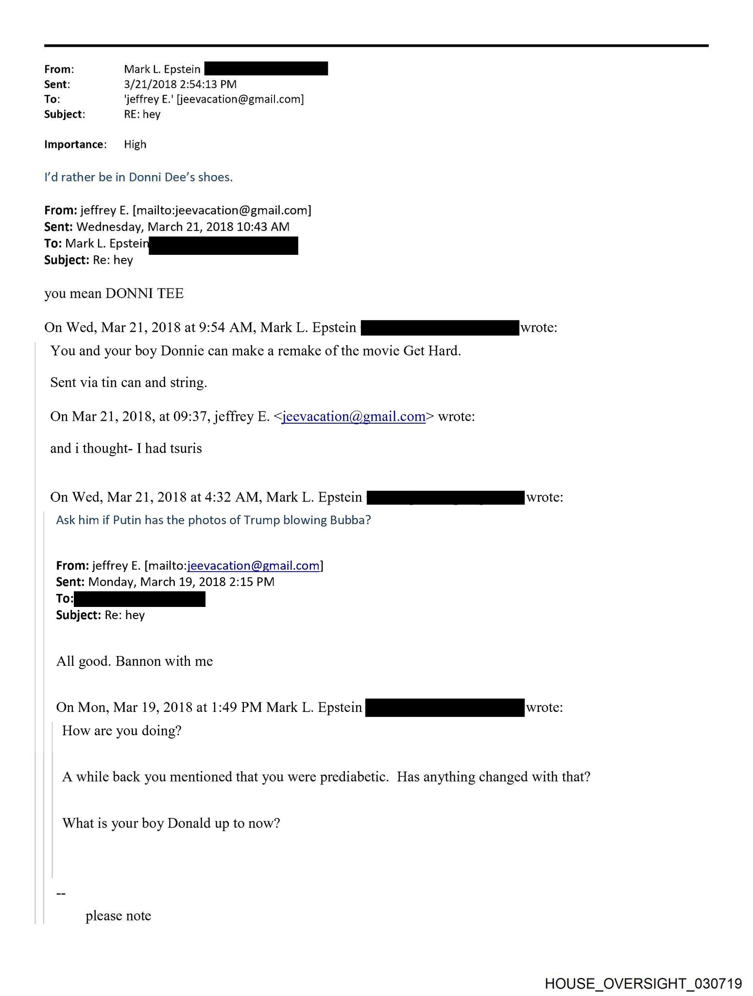 I am genuinely sorry if ErosBlog is the first place where this story reaches you. On Wednesday, the House Oversight Committee released about 20,000 emails pertaining to Jeffry Epstein, and among them was an exchange in which his brother Mark asked him to enquire of Steve Bannon whether Putin “has the photos” of Trump blowing Bubba. And all this time we were waiting for the pee tape: