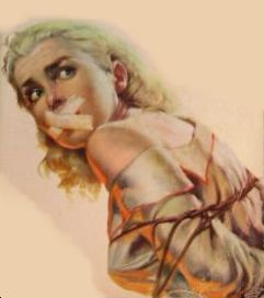 A good girl in trouble, from the cover of some detective fiction, courtesy of Bondage Blog: