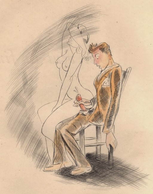 The woman sitting nude on his lap may be entirely imaginary, but that doesn’t stop her from being sexy as hell: