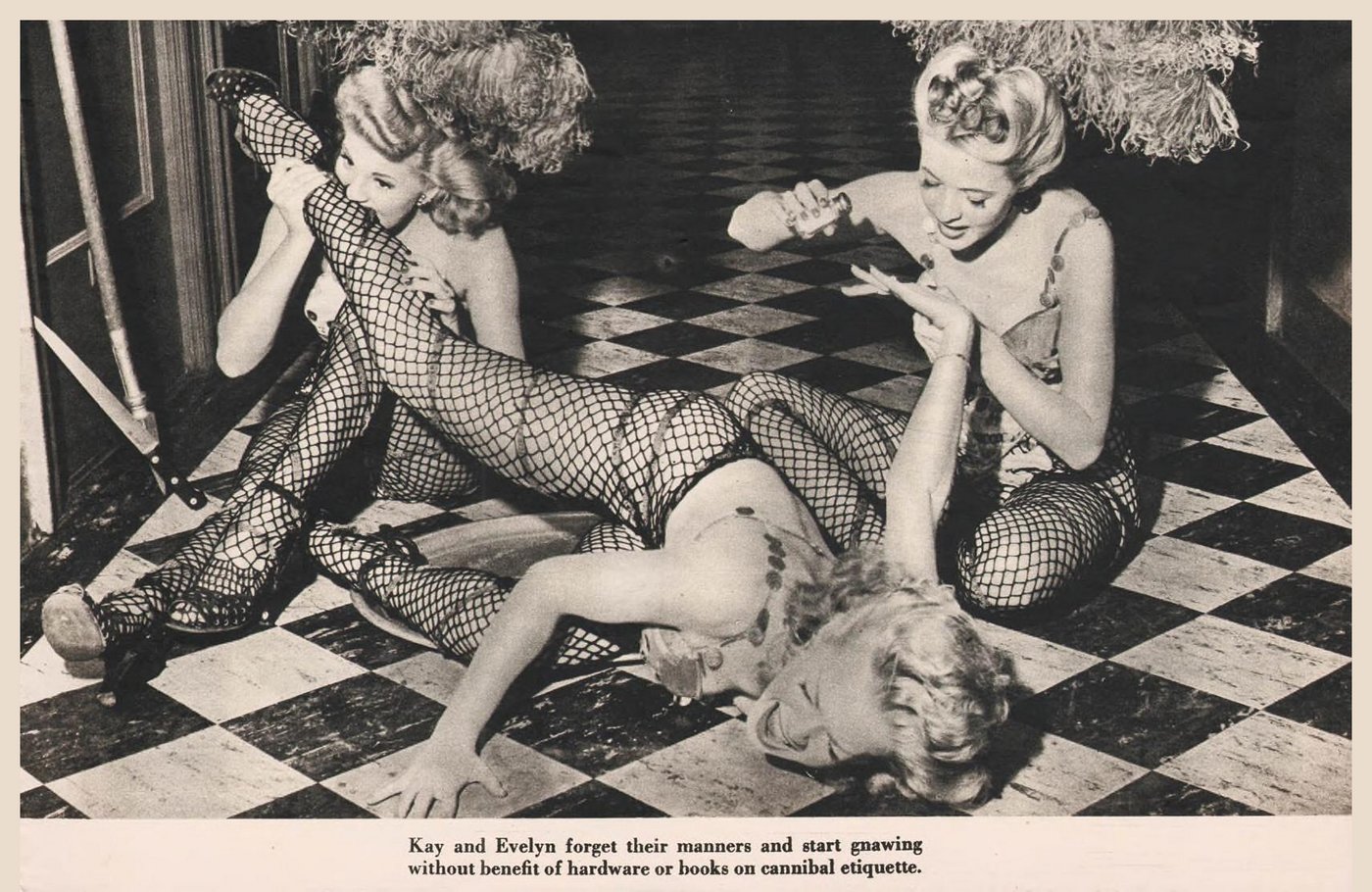 Night after night the chorus cuties at the Latin Quarter night club in New York dance a terrific cannibal number that whets the appetites of all the male customers present. However, the dance has its effects upon the chorines themselves, through the power of suggestion. It was inevitable that sooner or later fantasy should become reality to these gals, in accordance with the best psychological precepts. And the grim reality is something to take pictures about. It came about this way. One night it was impossible for the girls to go out between shows for their usual snack, as the rain was falling in torrents. Lightning crackled in the air and the thunder sounded like the crashing of B-29 bombs on Tokyo. Now, everybody knows that rain, lightning, and thunder ruin a girl’s permanent, to say nothing of her disposition. Yet what to do? The girls were getting hungrier and hungrier. Then it happened, as it was bound to happen. Two lovely show girls, Kay Evans and Evelyn Lewis, started eyeing a particularly juicy morsel of a blonde, Margie Noble. The same idea occurred to them simultaneously. Their glances met and they exchanged a nod of understanding. If the next show was to go on, they simply had to eat. So, when the opportunity arose a short time later, they captured the unsuspecting Margie backstage, with the interesting consequences pictured herewith.