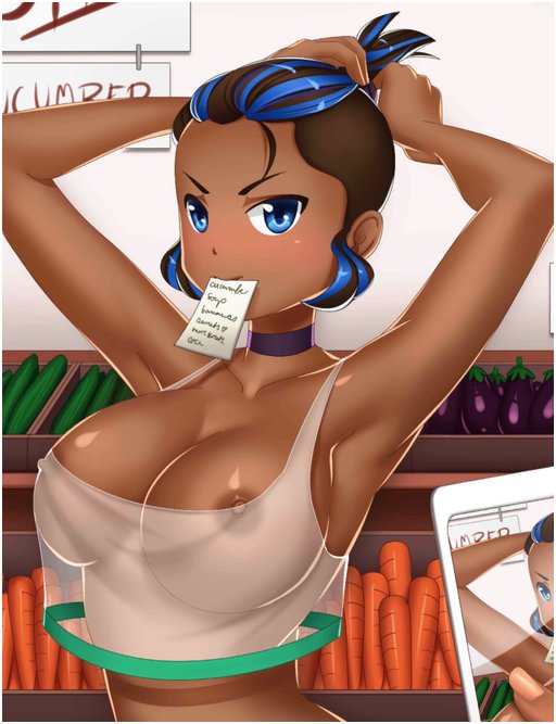 Image credits, top to bottom: The bodacious vampire pirate is by the artist Yayashin. The lady whose one-item shopping list is just sex lube and a salacious promise is by Mosbles. The sexy shopper with her grocery list in her mouth is by artist 虛次元, which translates to something like “Imaginary Dimension”. Finally, the eager wife who’s making her own honey for her husband’s honey-do list is drawn by Albo.