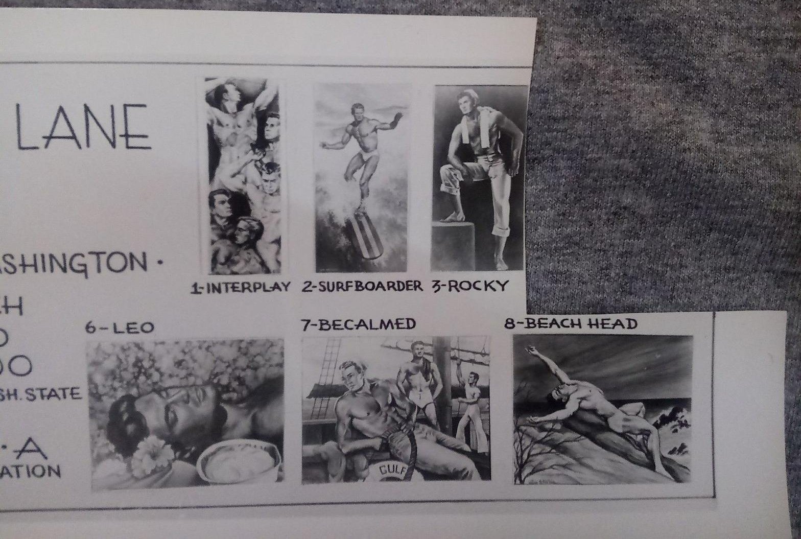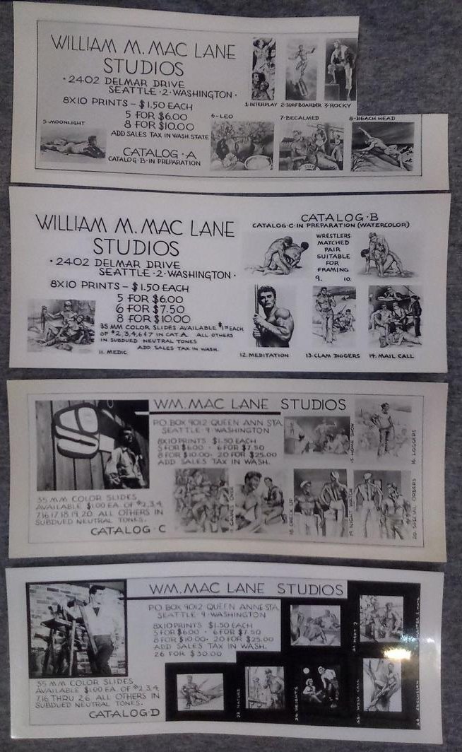 It’s not all over the internet, nor is it easy to find. Hints and indications are that it’s mostly sequestered in the private collections of wealthy collectors these days. But I did find these photographs of four small glossy black-and-white photographic brochure/catalogs advertising the Maclane Studios artwork. Click to embiggen, as they say.